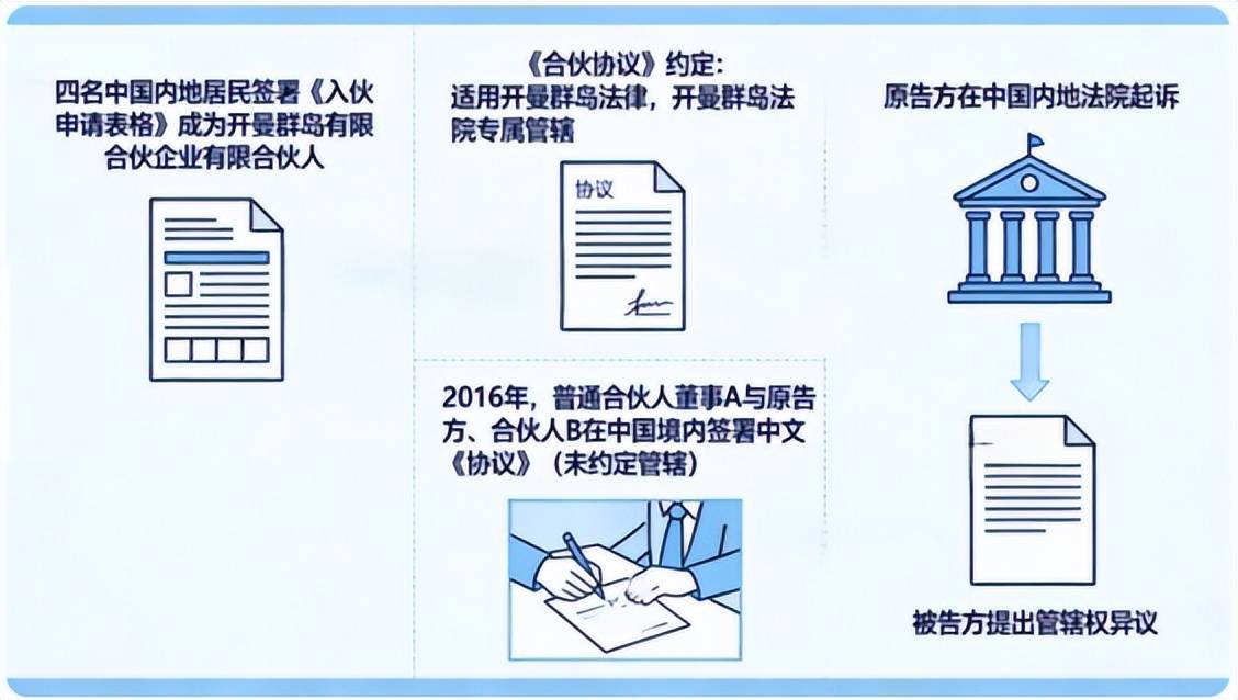 本案为一起涉及开曼群岛有限合伙企业(下称“合伙企业”)的跨境合伙纠纷。四名中国内地居民(下称“原告方”)通过签署《入伙申请表格》并获接纳,成为该合伙企业的有限合伙人。规范各方核心权利义务的基础法律文件为《合伙协议》,其中明确约定适用开曼群岛法律并由开曼群岛法院专属管辖。2016年,合伙企业的普通合伙人(开曼群岛注册公司,下称“普通合伙人”)的董事A(中国公民)与原告方及另一合伙人B(中国公民)在中国境内另行签署了一份中文《协议》。该中文《协议》涉及投资金额、锁定期、收益分配等经营性安排,但未约定管辖法律与法院。后因投资退出等问题产生争议,原告方在中国内地法院,依据中文《协议》对普通合伙人及合伙企业(下称“被告方”)提起诉讼。团队接受普通合伙人及合伙企业的委托,代理本案件。被告方提出管辖权异议,主张《协议》系《合伙协议》框架下的从属安排或补充文件,本案争议应受《合伙协议》中约定的开曼群岛法律管辖及开曼群岛法院专属管辖。原告方则主张《协议》是独立合同,应在中国法院审理。