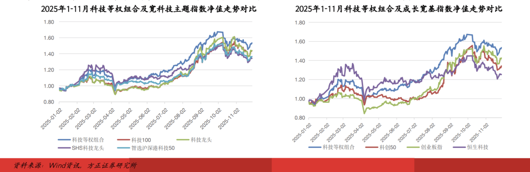 净值走势方面,相较对标宽科技主题指数,1-3月科技等权组合表现略输SHS科技龙头指数,但在6月之后,随着科技成长行情持续走强,科技等权组合展现出了更强的上涨弹性,稳定跑赢宽科技主题指数;对标科创50/创业板指/恒生科技三大成长宽基指数,10月科技行情调整之前,科技等权组合走势更为稳健持续,较少发生阶段震荡或回调,10月之后的净值回撤(-13.04%)也明显低于科创50(-16.45%)和恒生科技指数(-16.62%)。